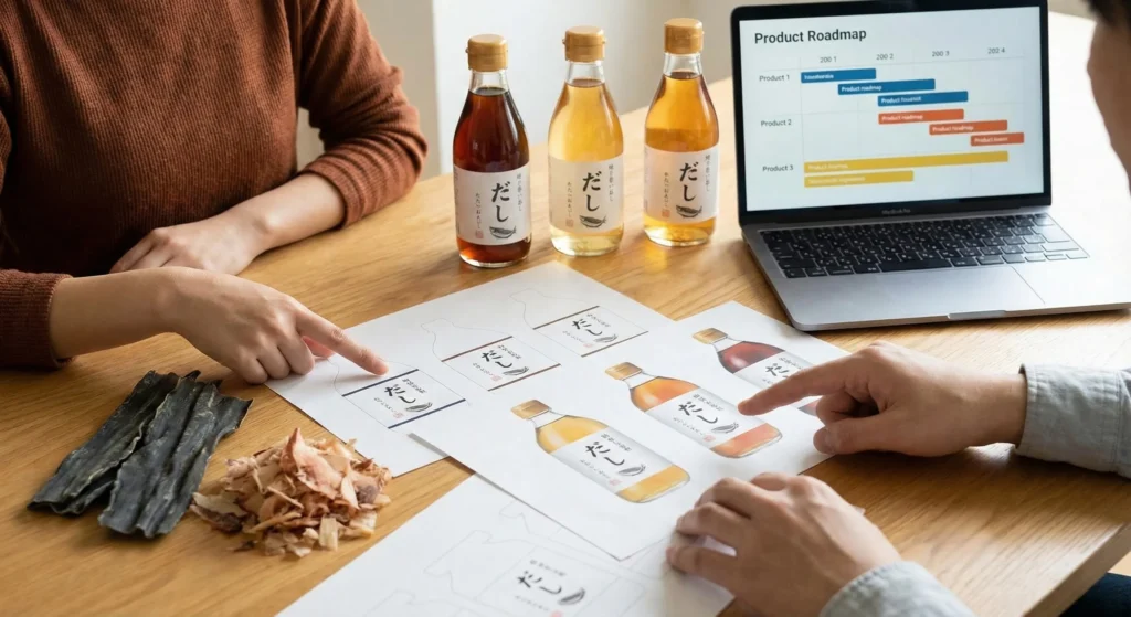 商品化には、”だし”だけでなく、ラベルデザインなどの制作や栄養成分表示などの法令対応も必要です。協力会社と連携し丸投げできる体制を整えています。